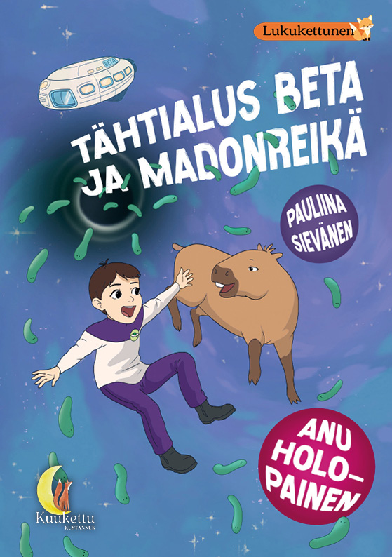 Kirjailija Anu Holopainen kirjoittaa monipuolisesti lapsille, nuorille ja aikuisille. Tähtialus Beta ja madonreikä on kolmas Lyyran ja Gallen seikkailuista kertova kirja. Jokainen teos on itsenäinen tarina. Helppolukuinen Tähtialus Beta ja madonreikä kuuluu myös Kuukettu Kustannuksen Lukukettunen-sarjaan, joka on tarkoitettu aloitteleville lukijoille. Kirjassa on Pauliina Sieväsen vauhdikas värikuvitus ja helppoa tekstiä aukeamilla on maltillisesti.